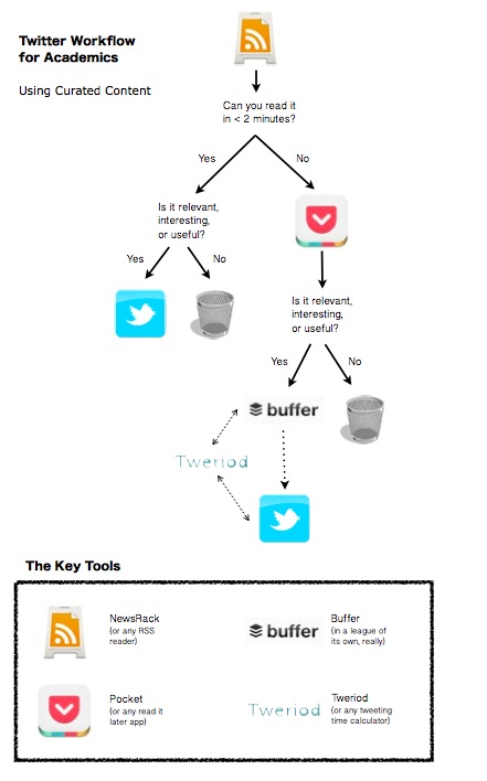 Reblog: Using Twitter for Curated Academic Content: The job of the humanities academic has always been to absorb large amounts of content, evaluate it, synthesize it, and portray the results in a way that will be relevant and engaging to an audience (whether that audience be students, peers, or the wider society). In the information age, we have a vast array of new tools to not only help us sort through this content, but also to shape it and share it.